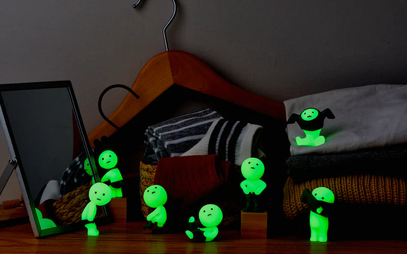 Each figure is made from phosphorescent material that absorbs light and glows softly in the dark.